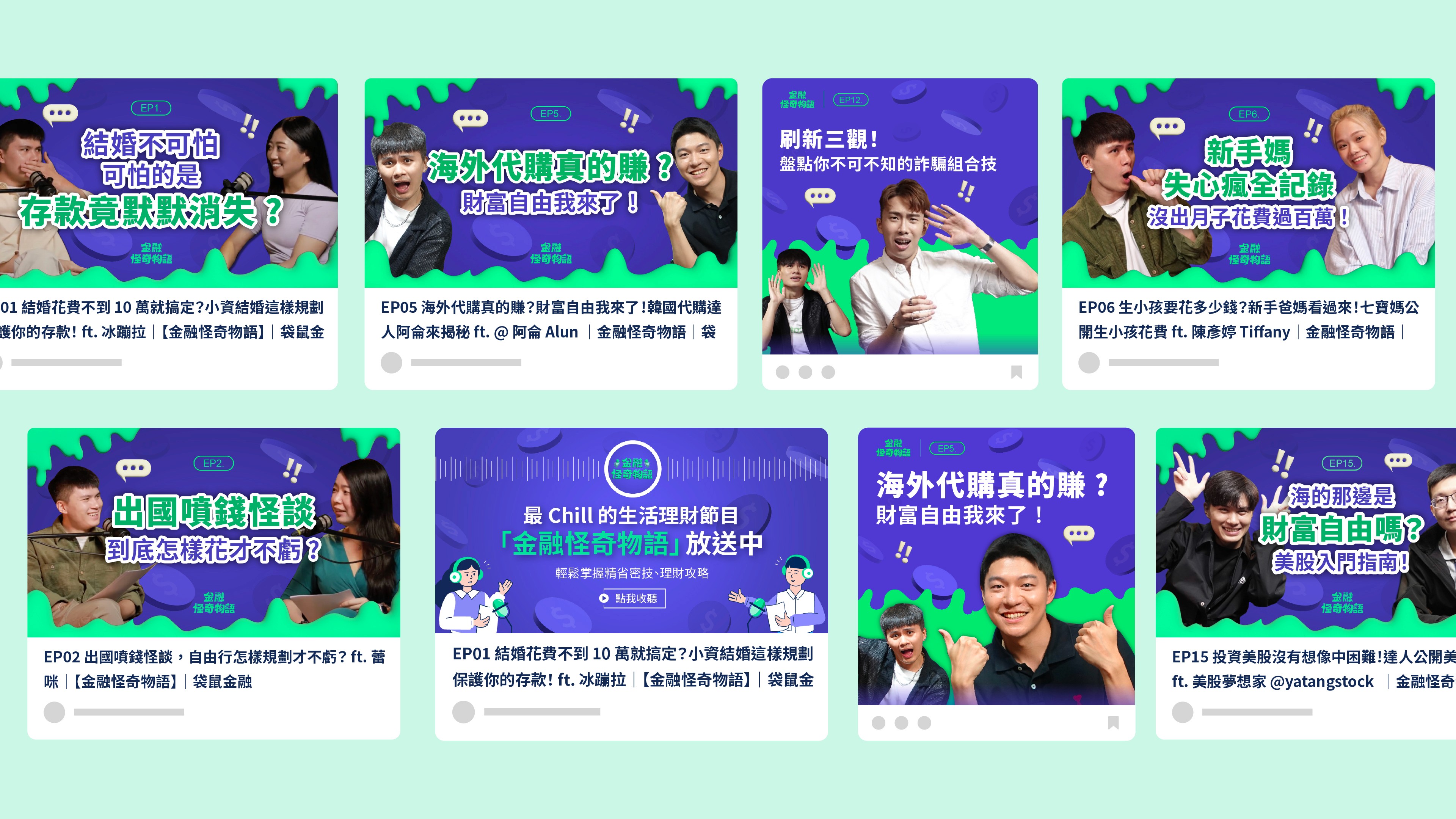 除了常態性的設計素材外,我也參與了一些品牌線上、線下行銷活動的製作,如活動禮品卡片設計、《金融怪奇物語》Podcast Youtube Thumbnail 及廣告設計、Line 圖文選單等。