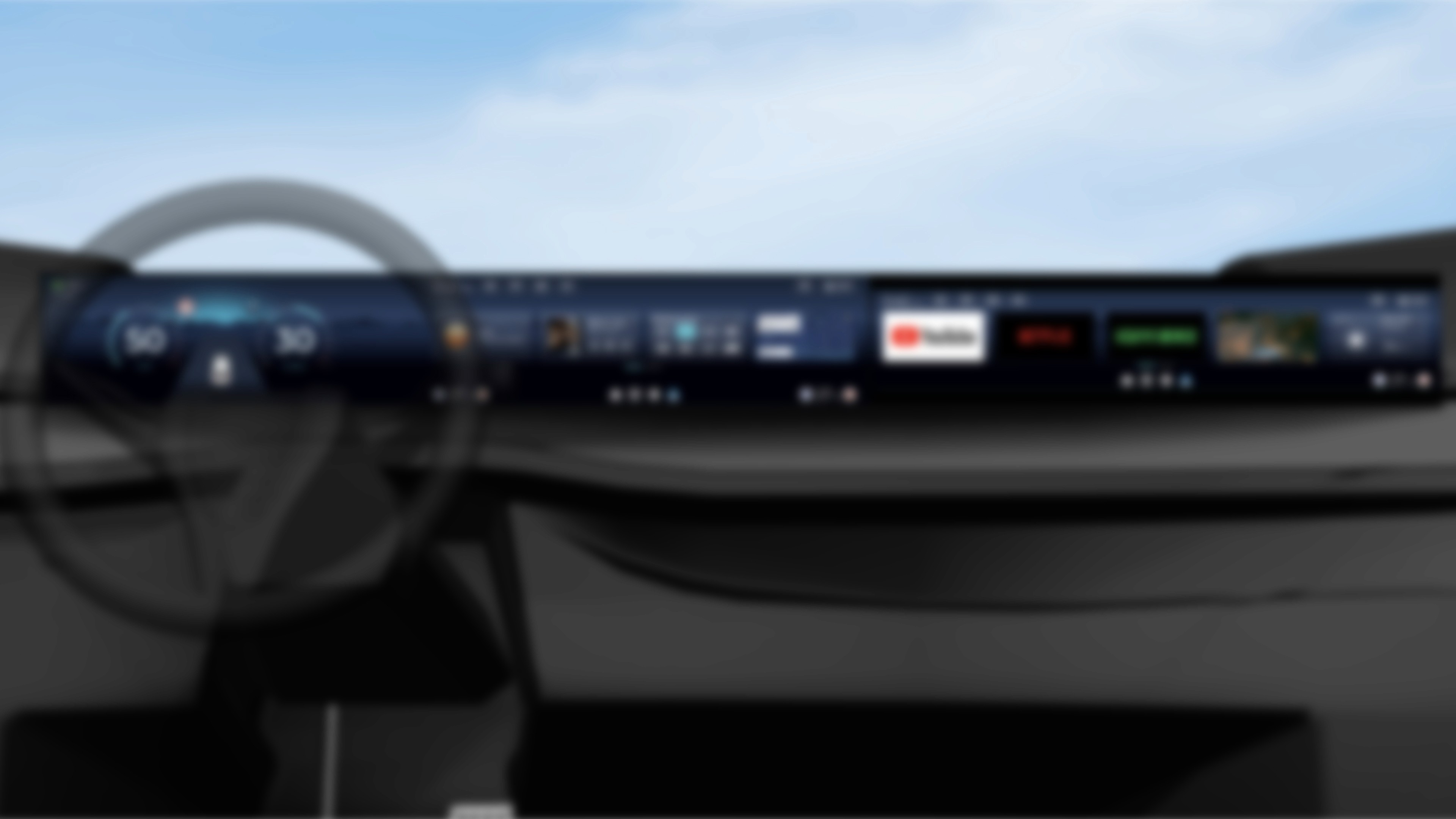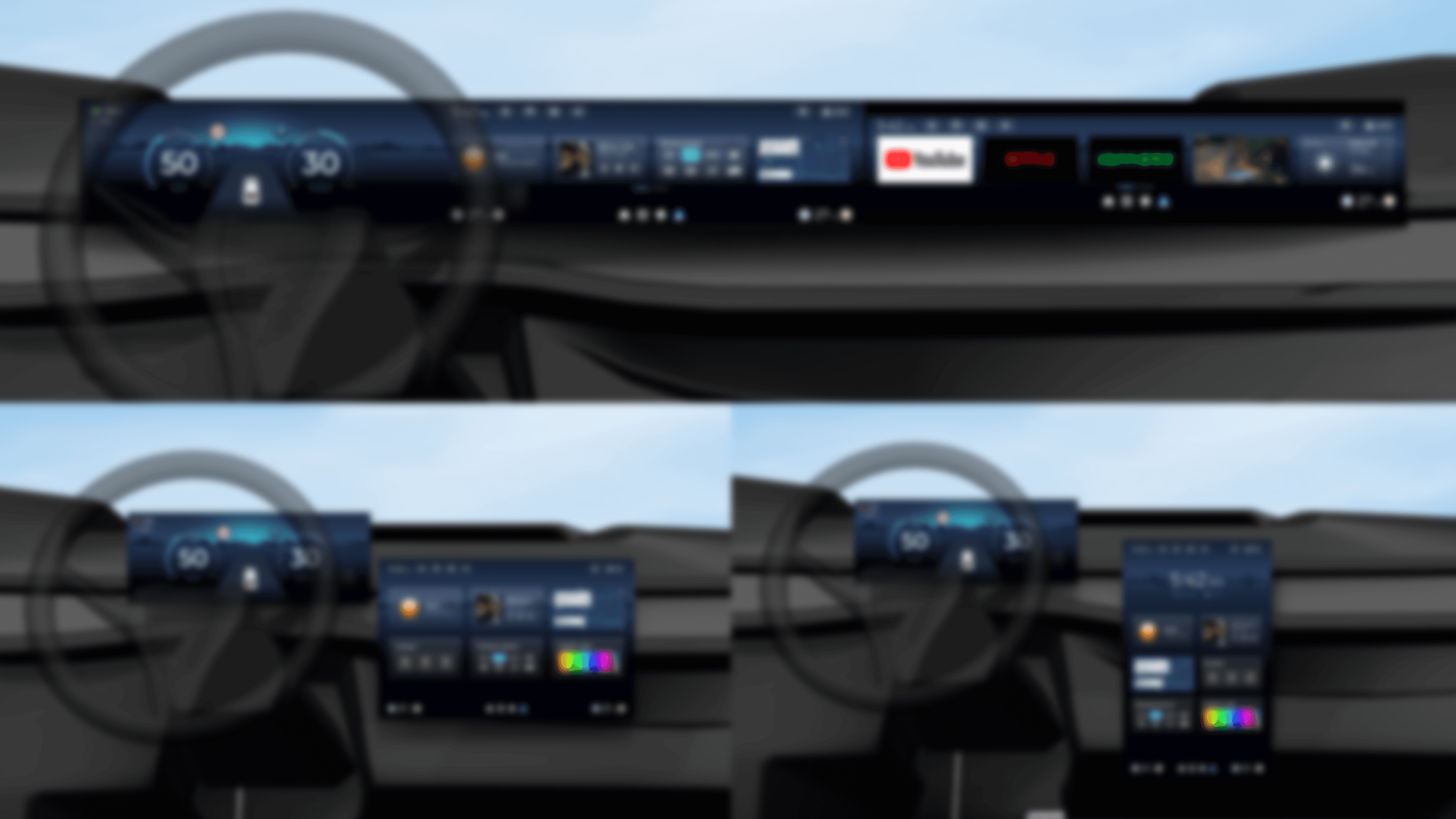 在 UI 設計上,我統整近年的設計趨勢,以情境式的全境背景為主,並將 Widgets 作為主要 UI 元素,除了讓介面有一致性,也能更好的適應不同尺寸的螢幕。最終設計版本我設計貫穿駕駛座及副座的長型螢幕、及兩種螢幕的直式橫式中控螢幕尺寸,確保在不同比例下能維持一致且流暢的使用體驗。