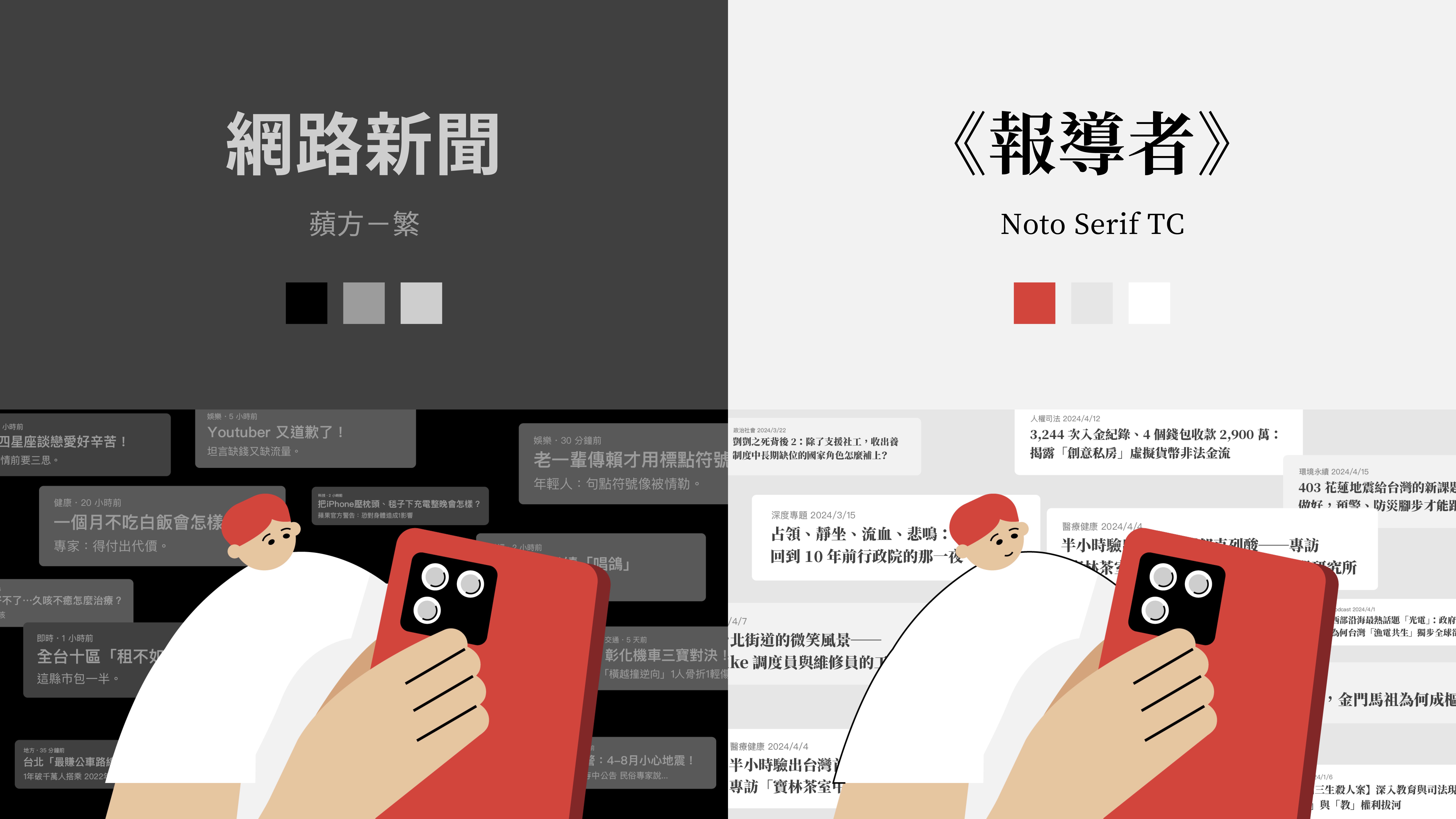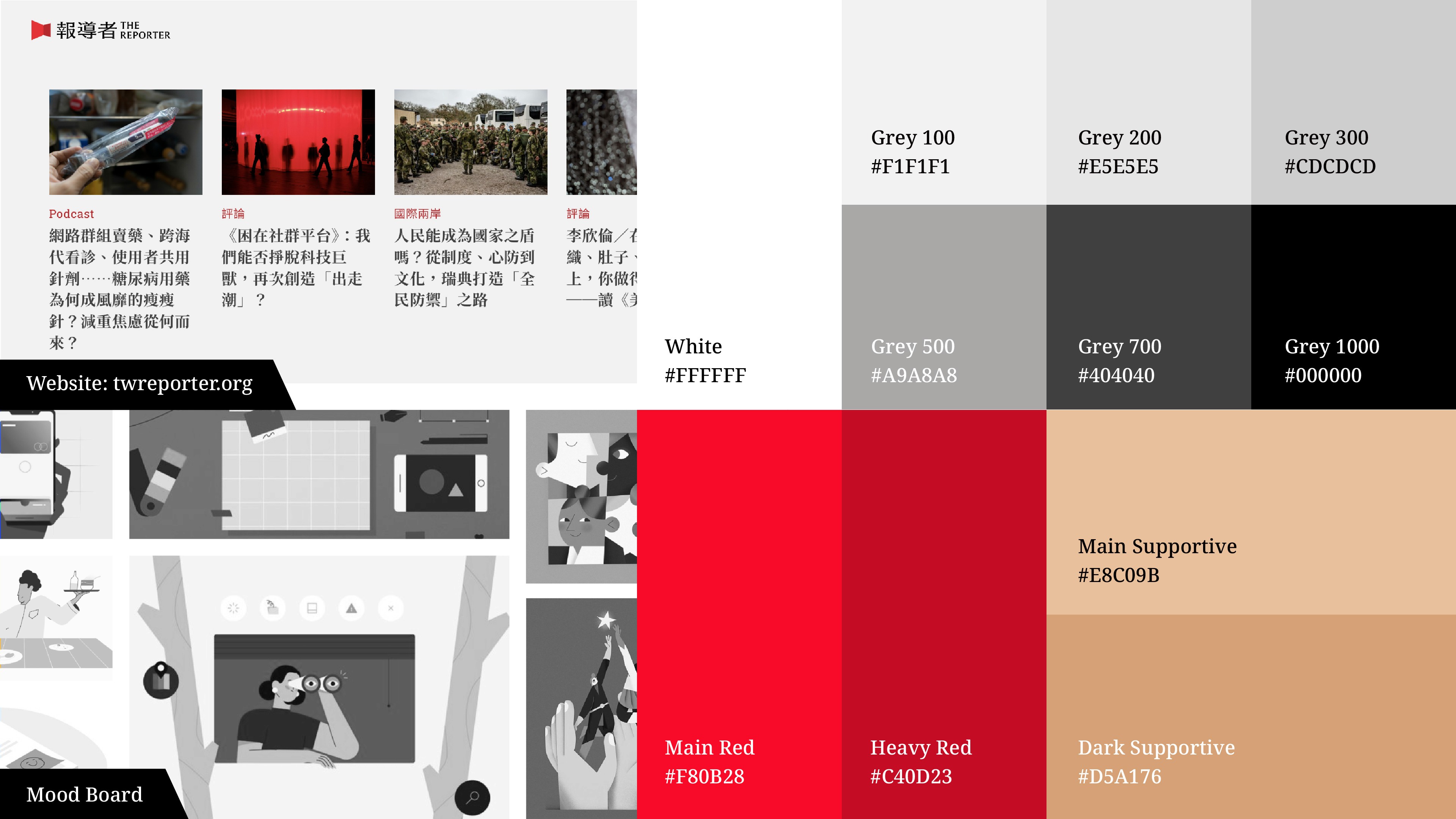 我以幾何插畫和線條延伸《報導者》的品牌風格,色彩則截取自品牌官網。在文字及色彩的選擇上,我透過前後對比呼應,強化品牌印象和視覺連結。