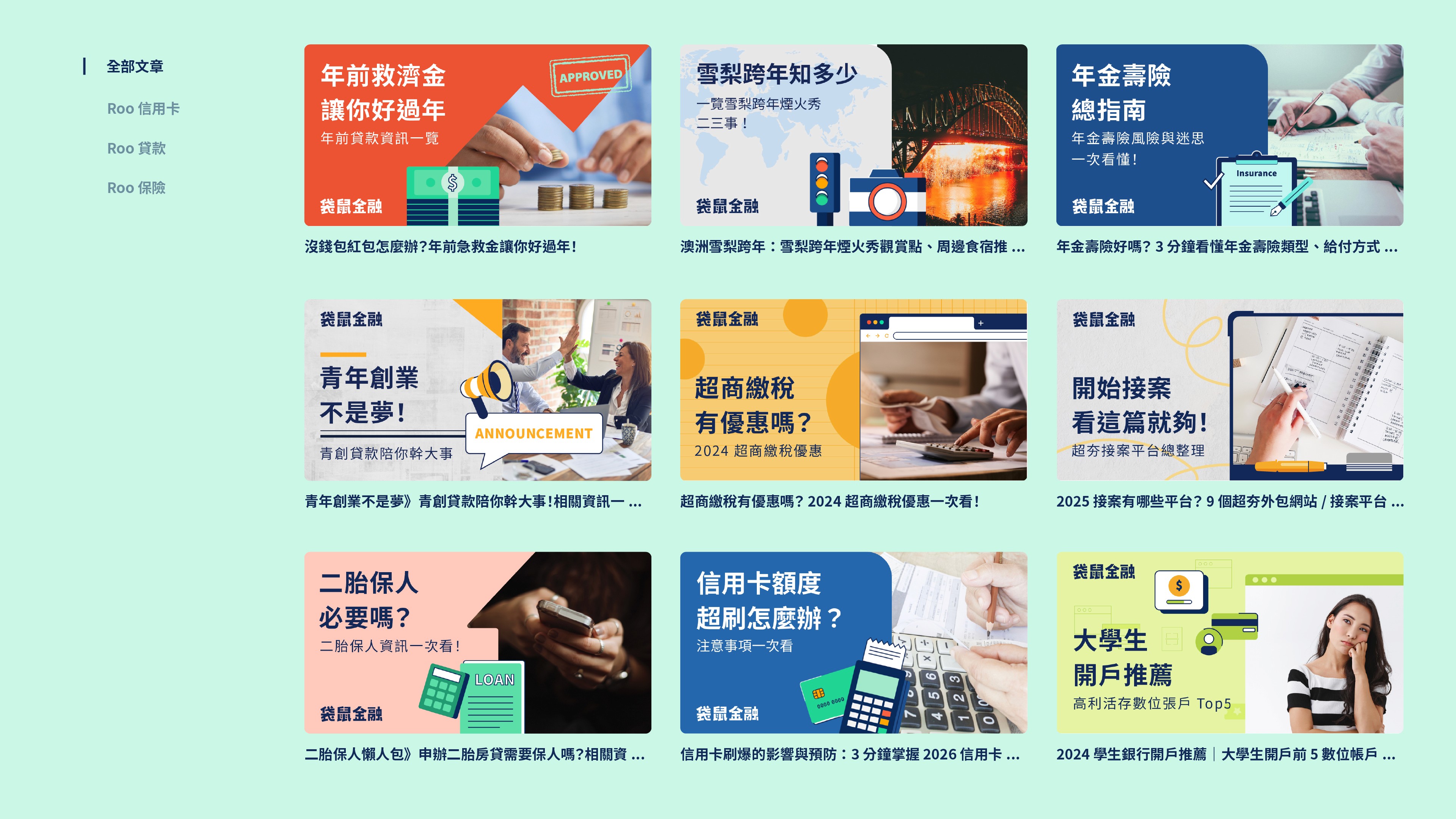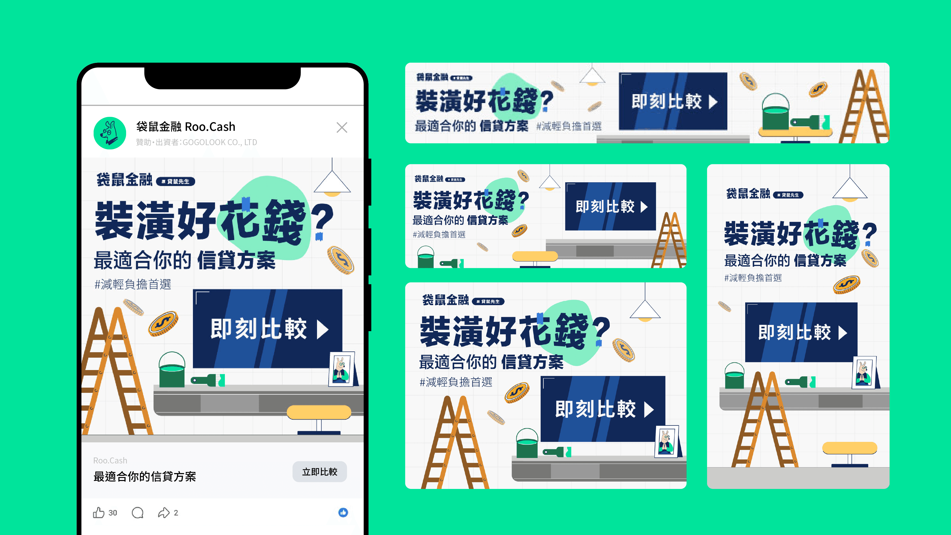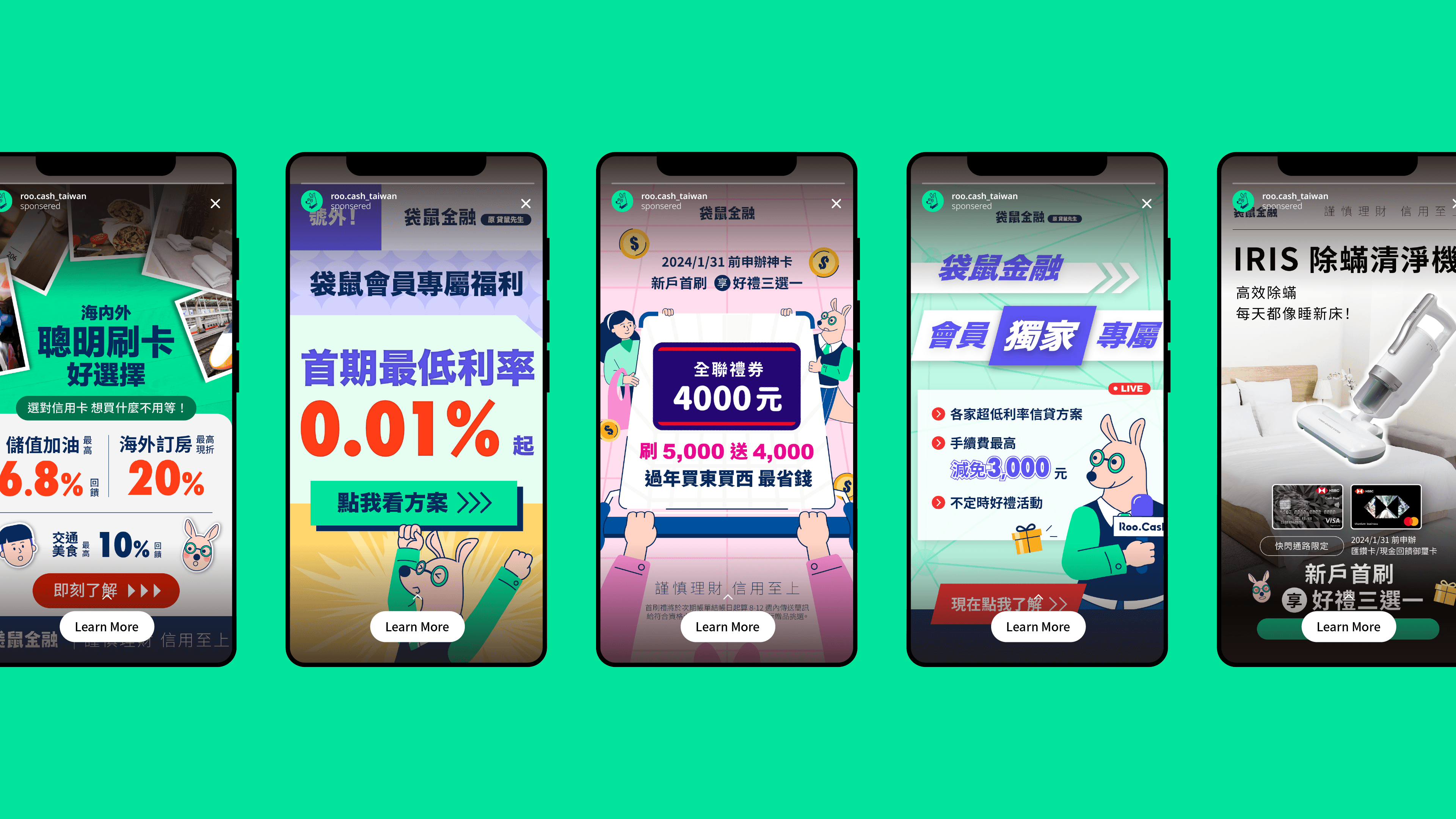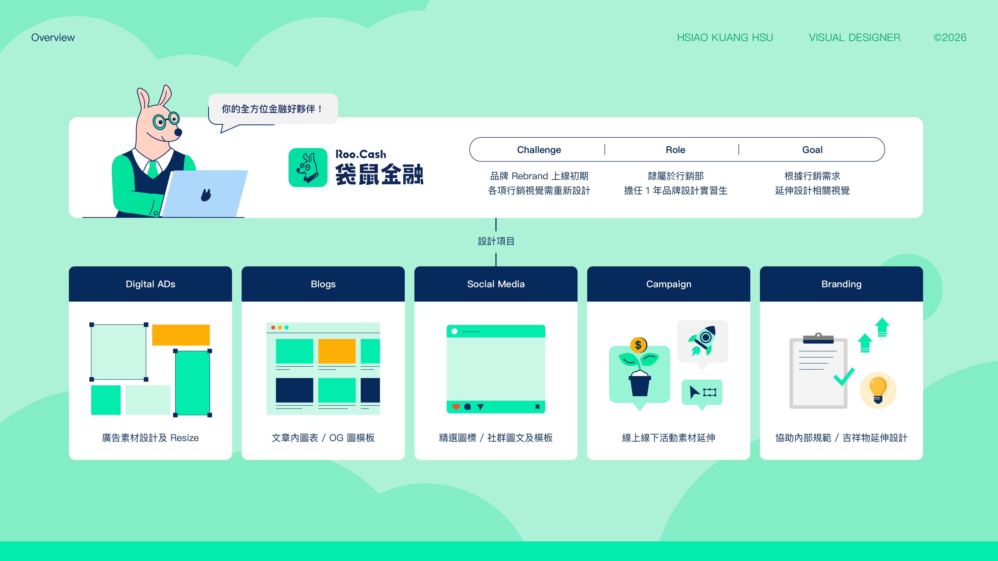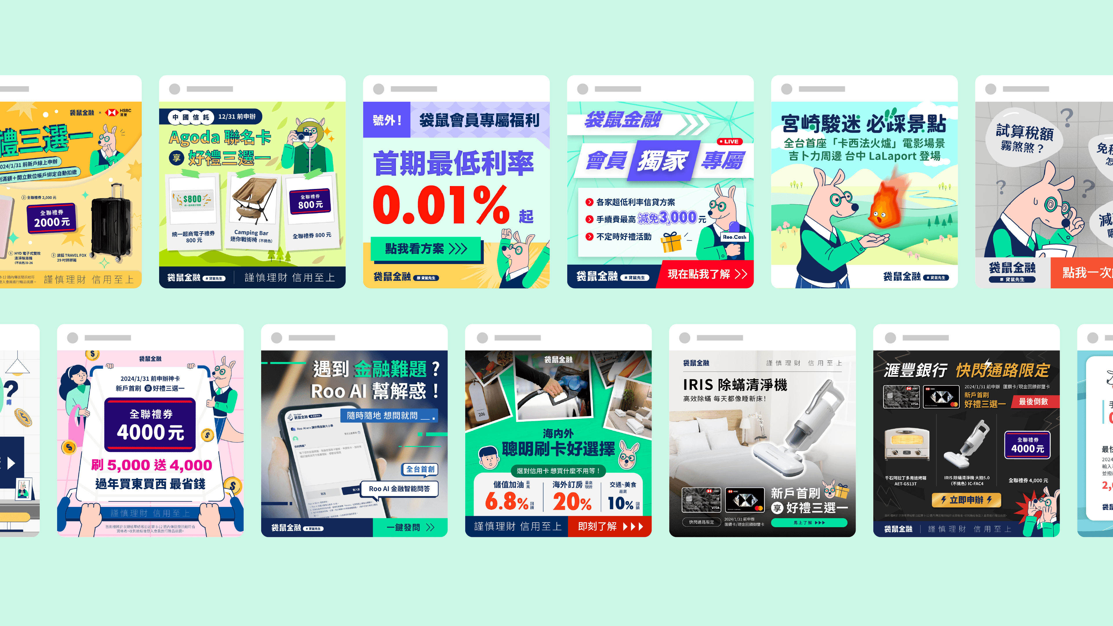 袋鼠金融 Roo.Cash (原貸鼠先生) -以普惠金融為目標的金融科技平台,專注防範金融詐騙,提供貸款、信用卡及投資理財等商品比較與試算工具。我在品牌 Rebrand 初期加入行銷團隊,負責延伸設計各項行銷素材,包含線上及線下設計物,如廣告、社群、部落格、與品牌活動素材等,確保品牌在各個接觸點的視覺一致性。