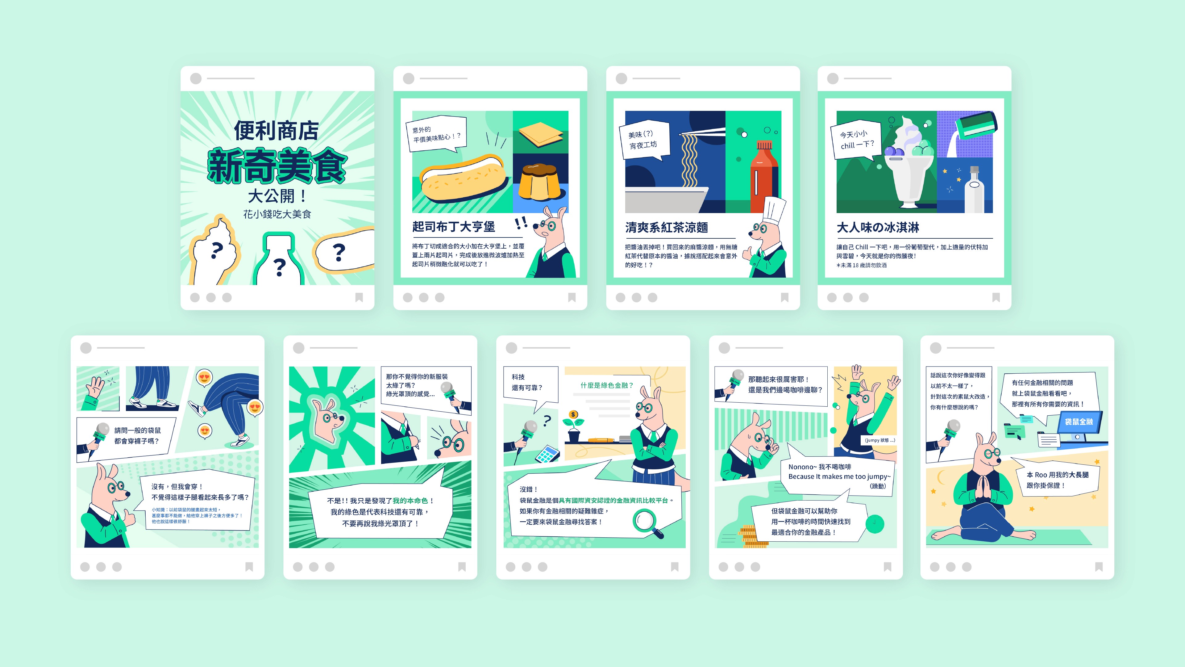根據需求設計各項社群素材,包括:社群貼文、IG 圖文模板、精選動態圖標、吉祥物 (Mr. Roo) GIPHY 等。
